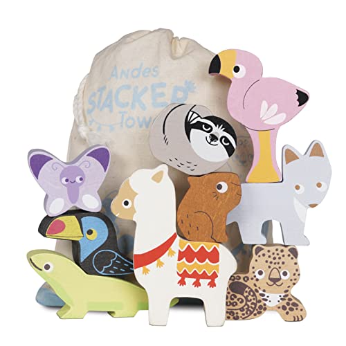 Le Toy Van - Wooden Toys - Andes Stacking Bag - Petilou Forest Building Blocks Stacker Bag Educational Balancing Activity Toy - Wooden Blocks Tropical Animal Toys - Kids Toys Age 18 Months +